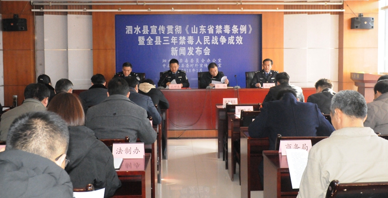 1月12日,泗水县召开宣传贯彻《山东省禁毒条例》暨全县三年禁毒人民战争成效新闻发布会,通报2017年度全县三年禁毒人民战争主要成效和破获的典型毒品案件,介绍《山东省禁毒条例》出台的背景意义和重点内容,号召社会各界和广大人民群众积极了解《条例》主要内容参与禁毒斗争,共同营造良好的社会环境。