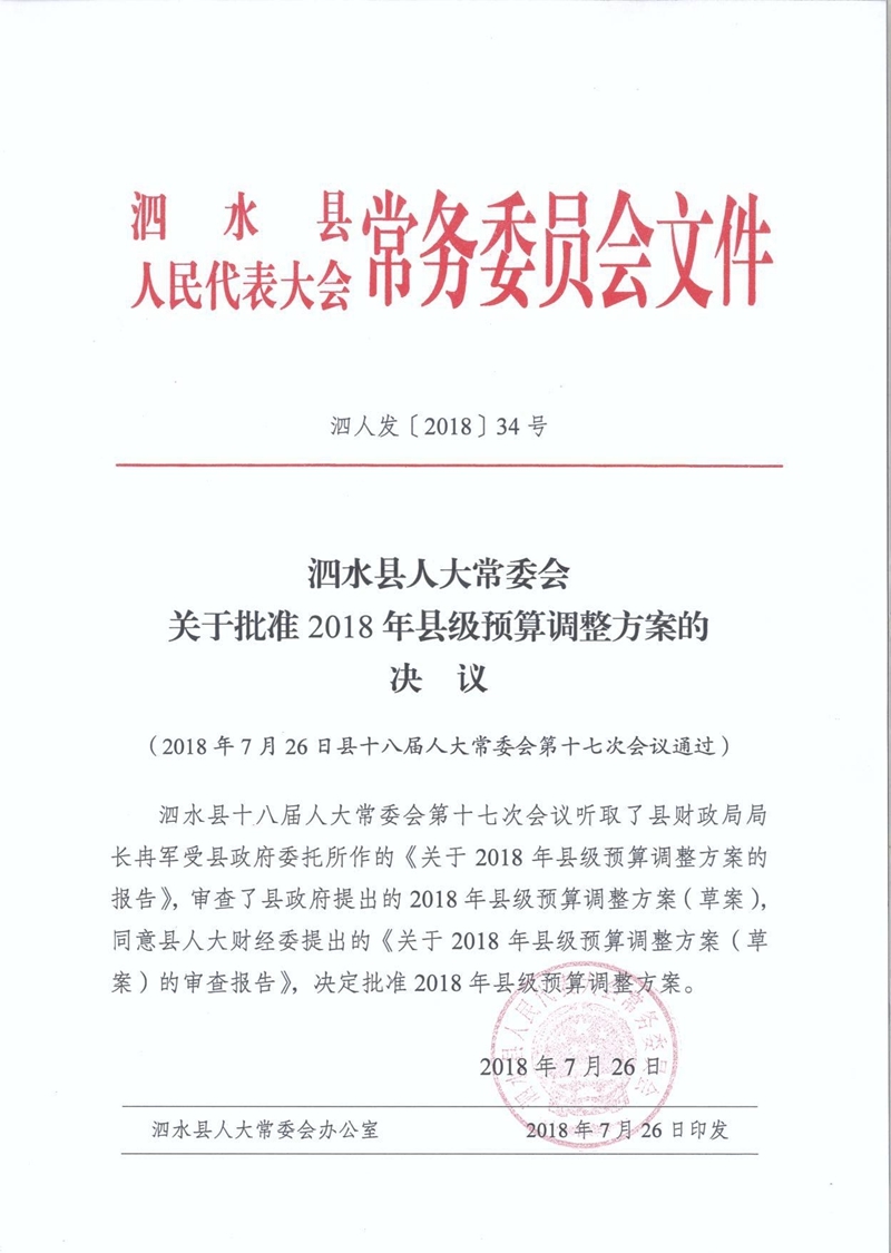 泗水县人大常委会关于批准2018年县级预算调整方案的决议