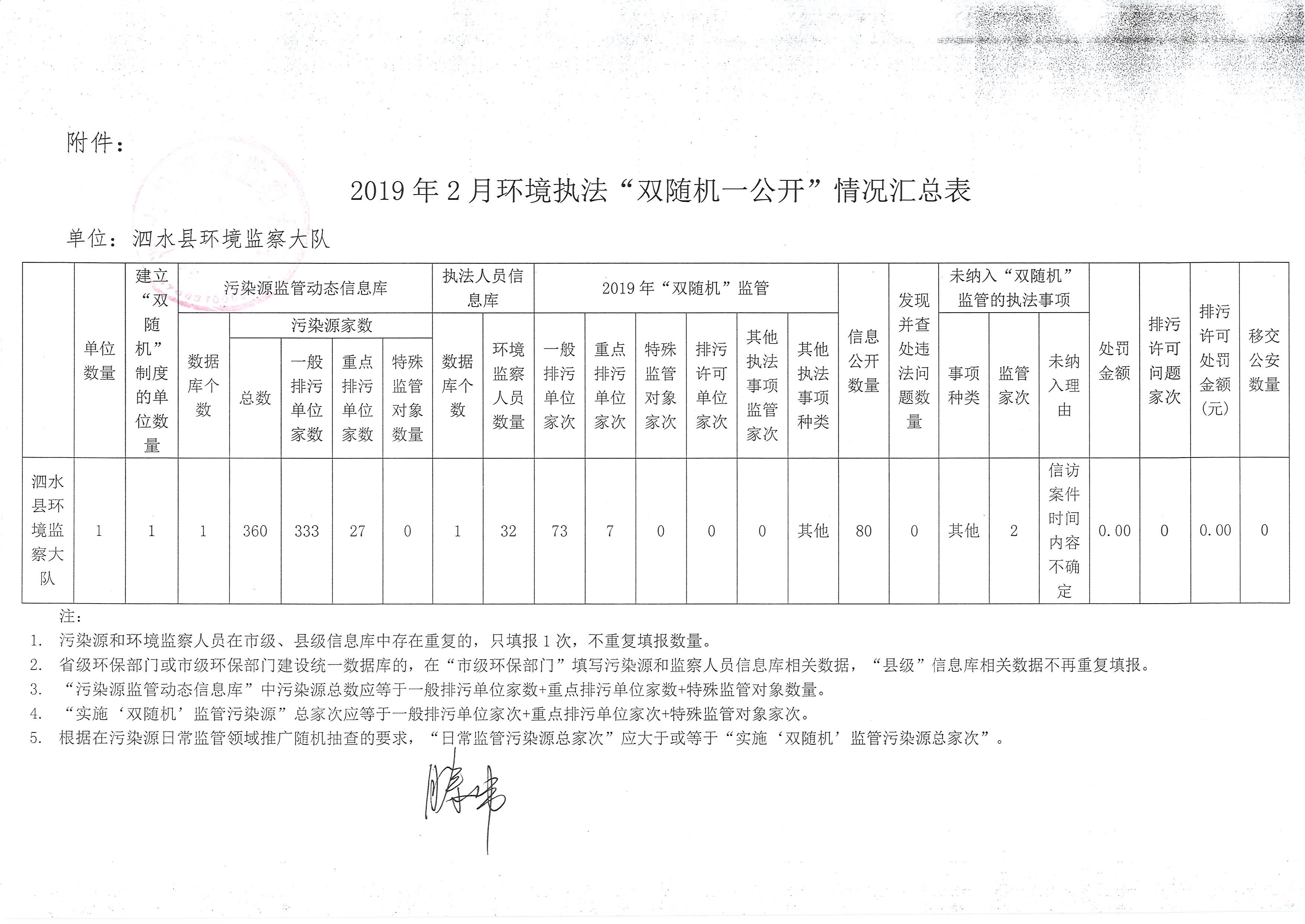 泗水县环境保护局2019年2月“双随机一公开”情况汇总表