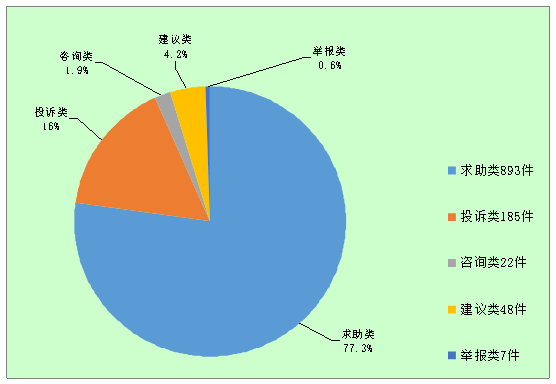 按来电来信内容分,求助类893件,占77.3%;投诉类185件,占16%;咨询类22件,占1.9%;建议类48件,占4.2%;举报类7件,占0.6%。