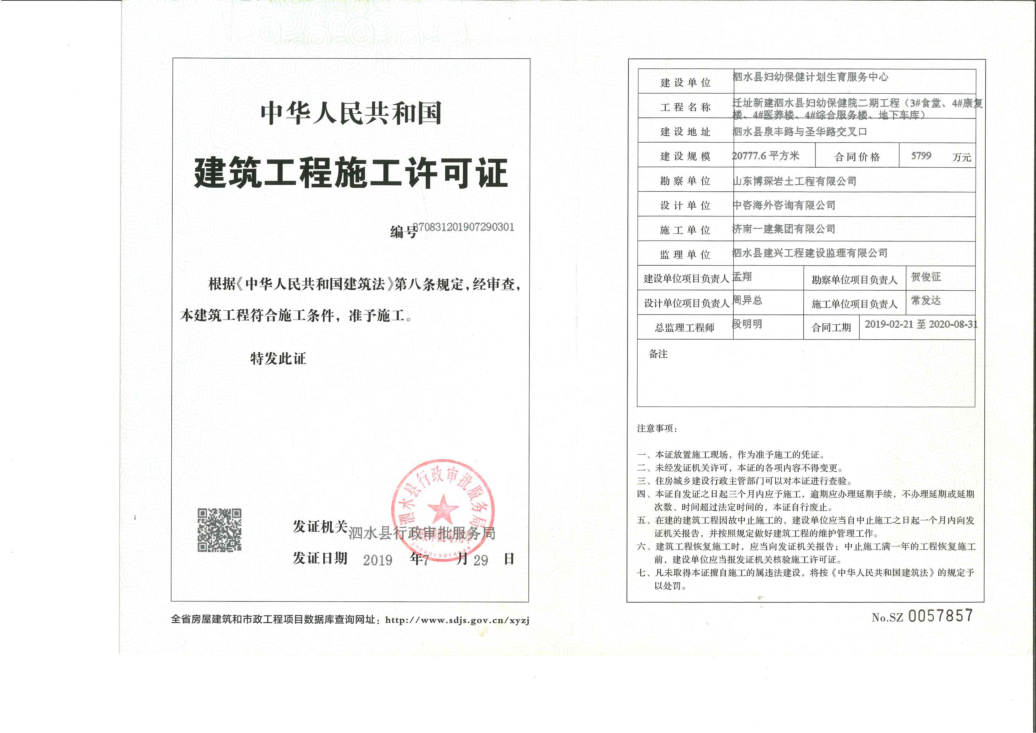 【施工有关信息】泗水县妇幼保健计划生育服务中心施工许可证