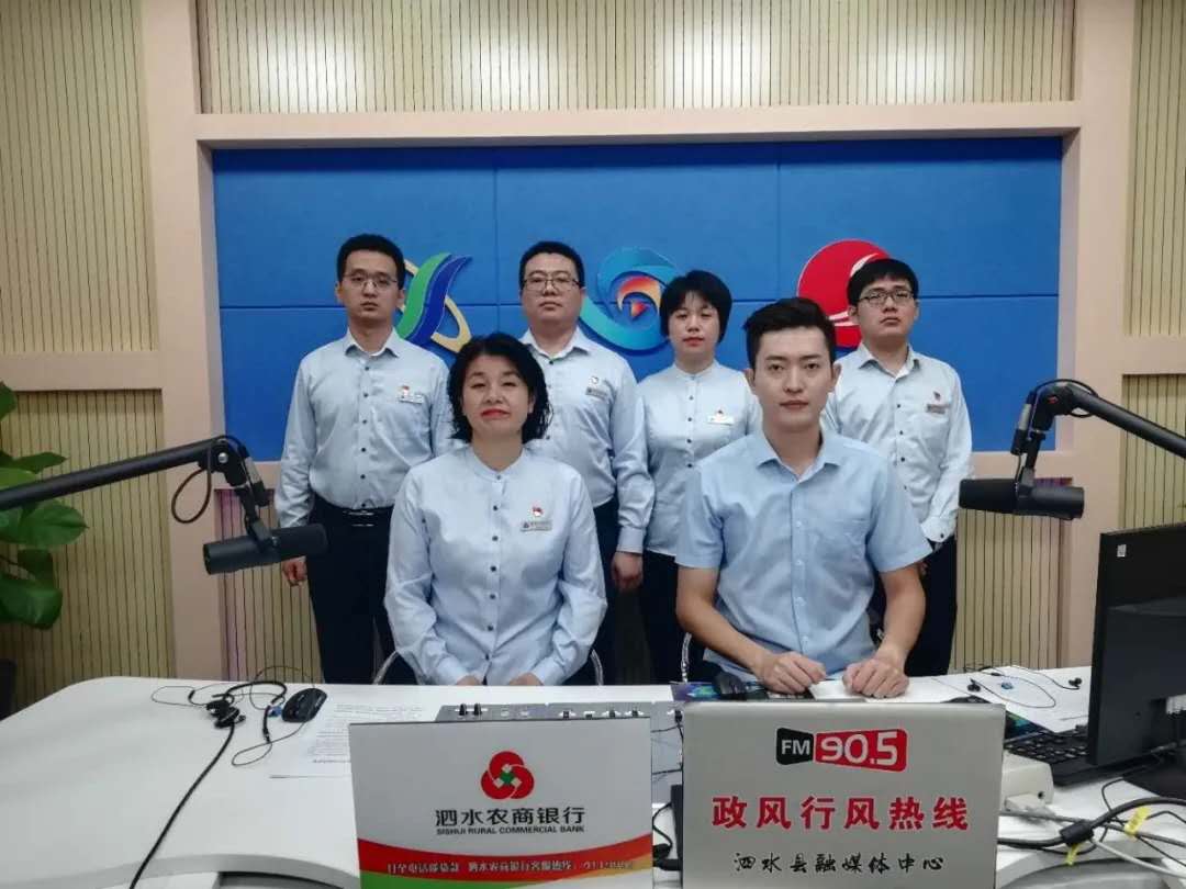 主持人:【欢迎回来,您现在关注的是泗水广播电视台正在直播的政风行风热线节目,我是节目主持人李海蛟,今天上线的嘉宾单位是泗水农商银行,带队走进直播间的是:泗水农商银行董事长徐清华。同时做客直播间的嘉宾还有:泗水农商银行行长孟彬,市场拓展部总经理邵建,财务会计部总经理李小倩,信贷管理部总经理卢冲。听众朋友,如果您在收听我们节目的过程中,对泗水农商银行的相关工作有什么好的意见和建议,或者在涉及存款、贷款、银行卡等方面有什么需要咨询和反映的问题,欢迎拨打我们栏目的热线电话参与到节目当中。我们的热线电话是4321123 4231711。】