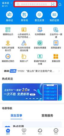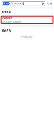 方式一:打开“爱山东”APP,在首页搜索栏输入并搜索要办理的交管服务,如“绑定驾驶证”。