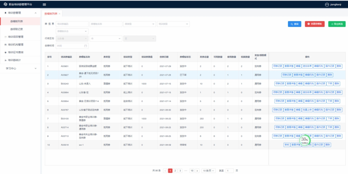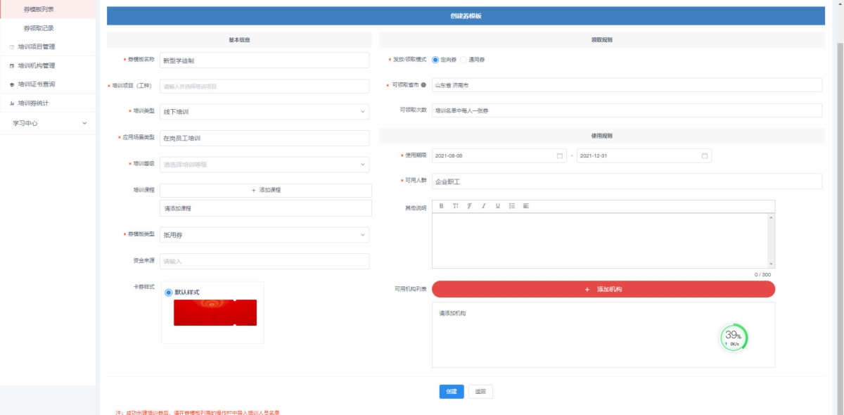 在人社部电子培训券管理后台(部管理后台),根据培训内容、可用机构、可用人群、有效期、发放数量等创建定制职业培训券模板。