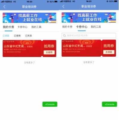 第三步:领取职业培训券:在【我的卡券】中查看自己的培训券,如果账户里没有卡券,去【卡券中心】领取。