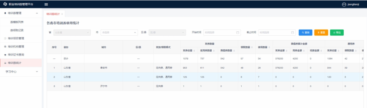 部平台和省系统都可查询职业培训券的领取数量、使用数量、结算数量、资金统计、领取人信息、培训券资金来源等。