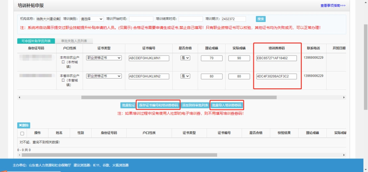 3.补贴申请提交职业培训券使用信息:提交补贴申请前,需要维护每个人的职业培训券码。维护完成后,点击【保存证书编号和培训券码】。省系统支持批量导入培训券码,机构可按班期批次进行学员职业培训券码登记。