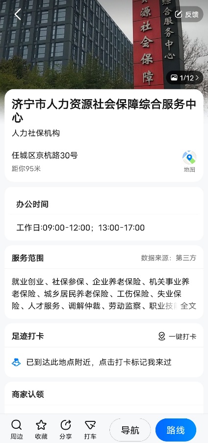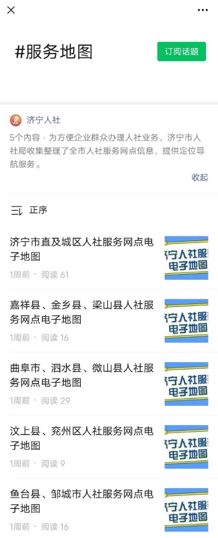 在“济宁人社”微信公众号,选中界面下方“服务地图”,进入 #服务地图 话题,选择您要去人社服务网点,即可一键导航。