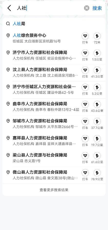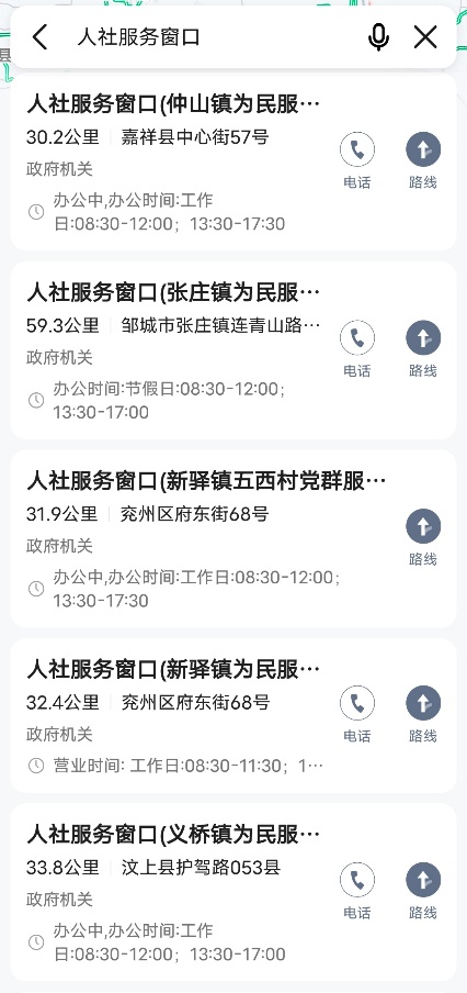 打开高德地图APP,在搜索栏输入“人社、人社服务窗口、人力资源社会保障”等关键字,即可查询到附近人社网点信息,点击“路线”以开启导航服务。