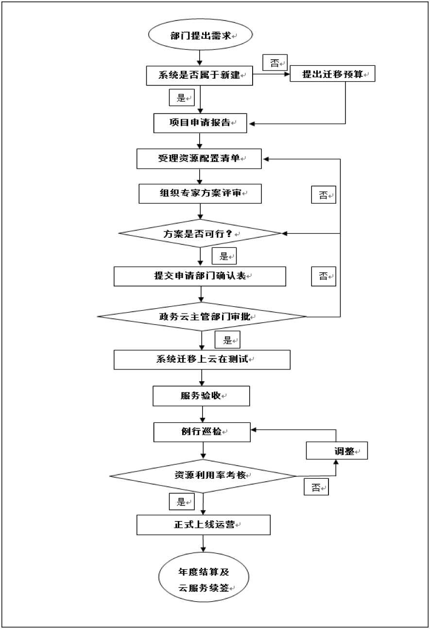 第一步 申请单位根据需求向政务云平台行政主管部门提出使用需求申请,并提供业务系统建设方案、业务系统性能和安 全自测报告、政务云平台资源(以下简称云资源,含云主机、云存储、互联网等)需求及其他申请材料。