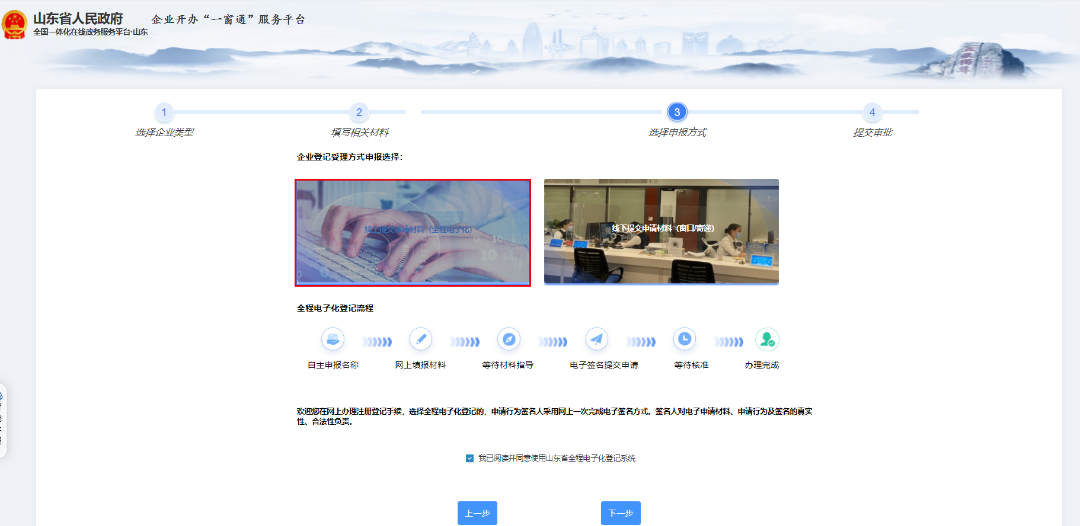 4.信息填写完成后,选择“线上提交申请材料(全程电子化)”,进入下一步。