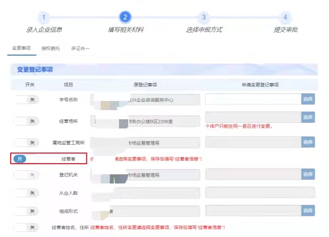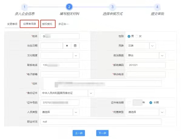 3.变更事项首页中,勾选“经营者”变更事项,进入下一步,依次填写新经营者及委托代理人信息。