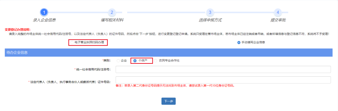 1.选择“营业执照变更(备案)登记”,可使用电子营业执照扫码登陆,也可输入个体工商户统一社会信用代码及原经营者身份证号码。