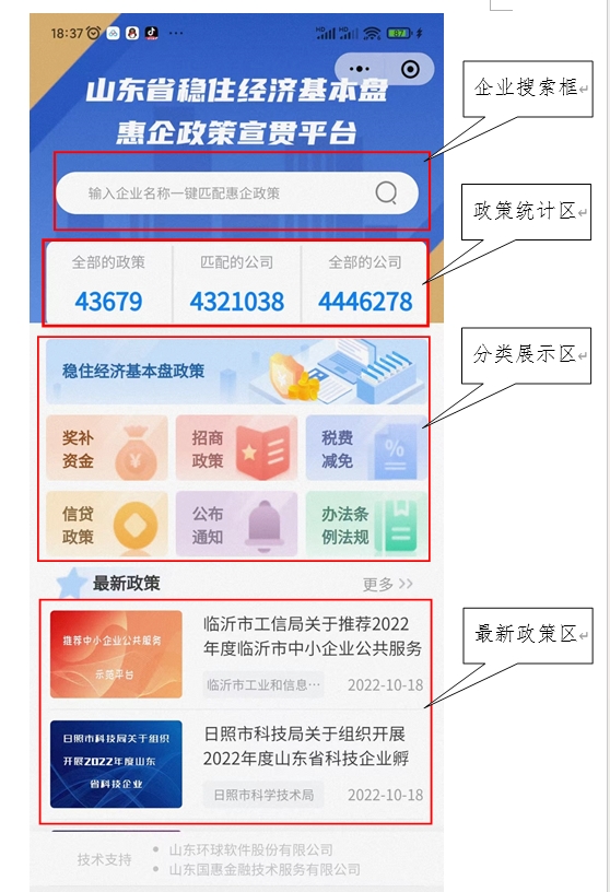 打开首页,从上到下,依次是企业搜索框、政策统计区、分类展示区、最新政策区。
