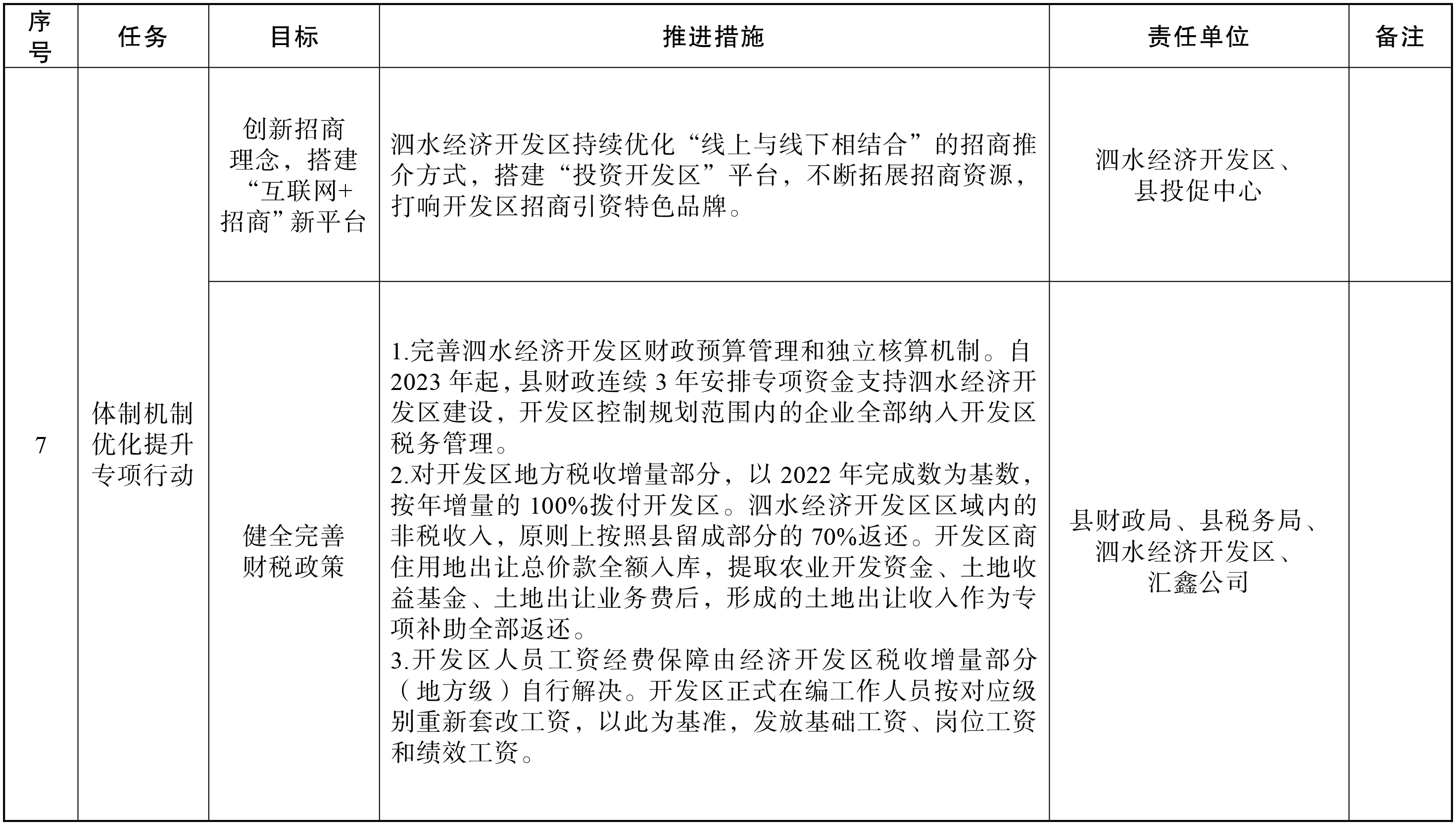 1.优化泗水经济开发区规划。适时启动泗水经济开发区核心区控制性规划编制,明确园区整合及拟新拓展区域的空间四至、功能布局、路网框架等内容,合理设置产业发展区、管理服务区、商业服务区、居住生活区等。科学划定泗水经济开发区开发边界,优化调整管辖范围,实行“一区多园”,将工业熟地等调整至园区范围,扩大工业发展承载空间。(责任部门:县自然资源和规划局、县住房城乡建设局、泗水经济开发区)