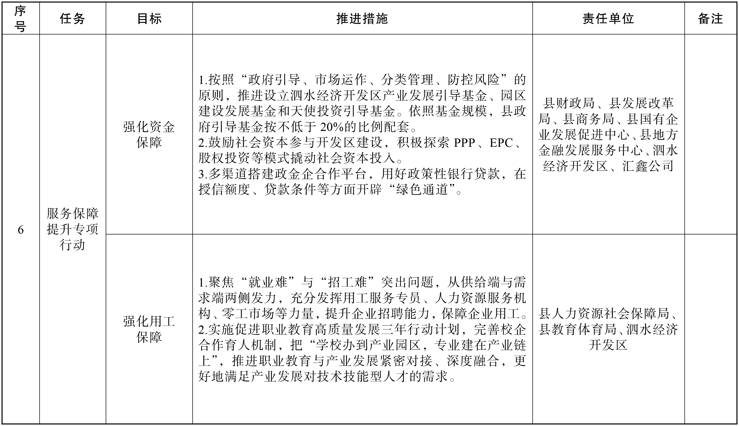 2.强化用工保障。聚焦“就业难”与“招工难”突出问题,从供给端与需求端两侧发力,充分发挥用工服务专员、人力资源服务机构、零工市场等力量,提升企业招聘能力,保障企业用工。实施促进职业教育高质量发展三年行动计划,完善校企合作育人机制,把“学校办到产业园区,专业建在产业链上”,推进职业教育与产业发展紧密对接、深度融合,更好地满足产业发展对技术技能型人才的需求。(责任单位:县人力资源社会保障局、县教育和体育局、泗水经济开发区)