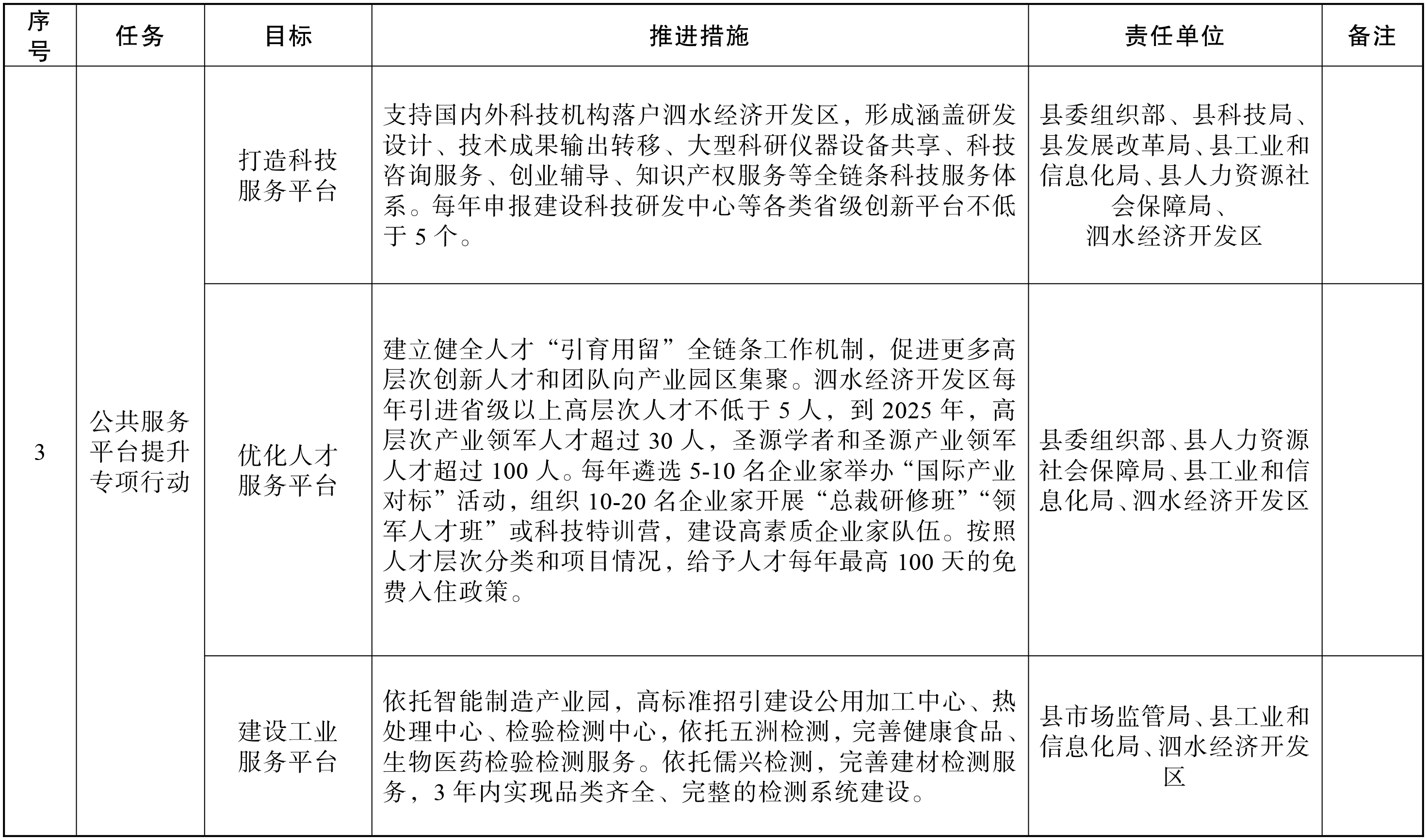 1.打造科技服务平台。支持国内外科技机构落户泗水经济开发区,形成涵盖研发设计、技术成果输出转移、大型科研仪器设备共享、科技咨询服务、创业辅导、知识产权服务等全链条科技服务体系。每年申报建设科技研发中心等各类省级创新平台不低于5个。(责任单位:县委组织部、县科技局、县发展改革局、县工业和信息化局、县人力资源社会保障局、泗水经济开发区)