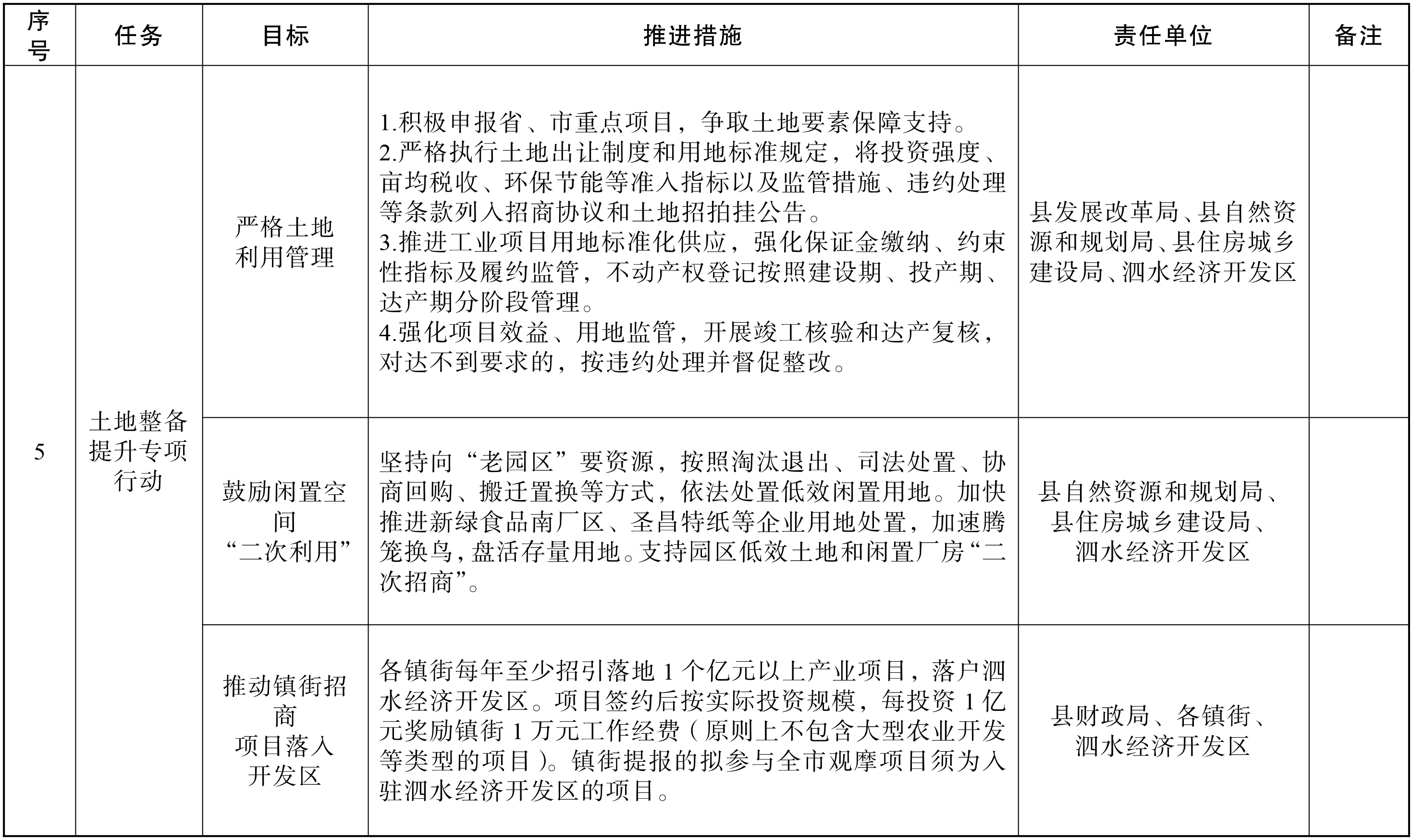 2.鼓励闲置空间“二次利用”。坚持向“老园区”要资源,按照淘汰退出、司法处置、协商回购、搬迁置换等方式,依法处置低效闲置用地。加快推进新绿食品南厂区、圣昌特纸等企业用地处置,加速腾笼换鸟,盘活存量用地。支持园区低效土地和闲置厂房“二次招商”。(责任部门:县自然资源和规划局、县住房城乡建设局、泗水经济开发区)