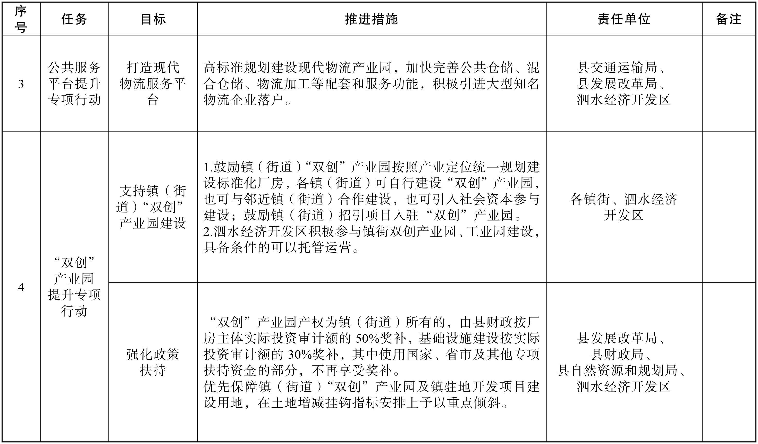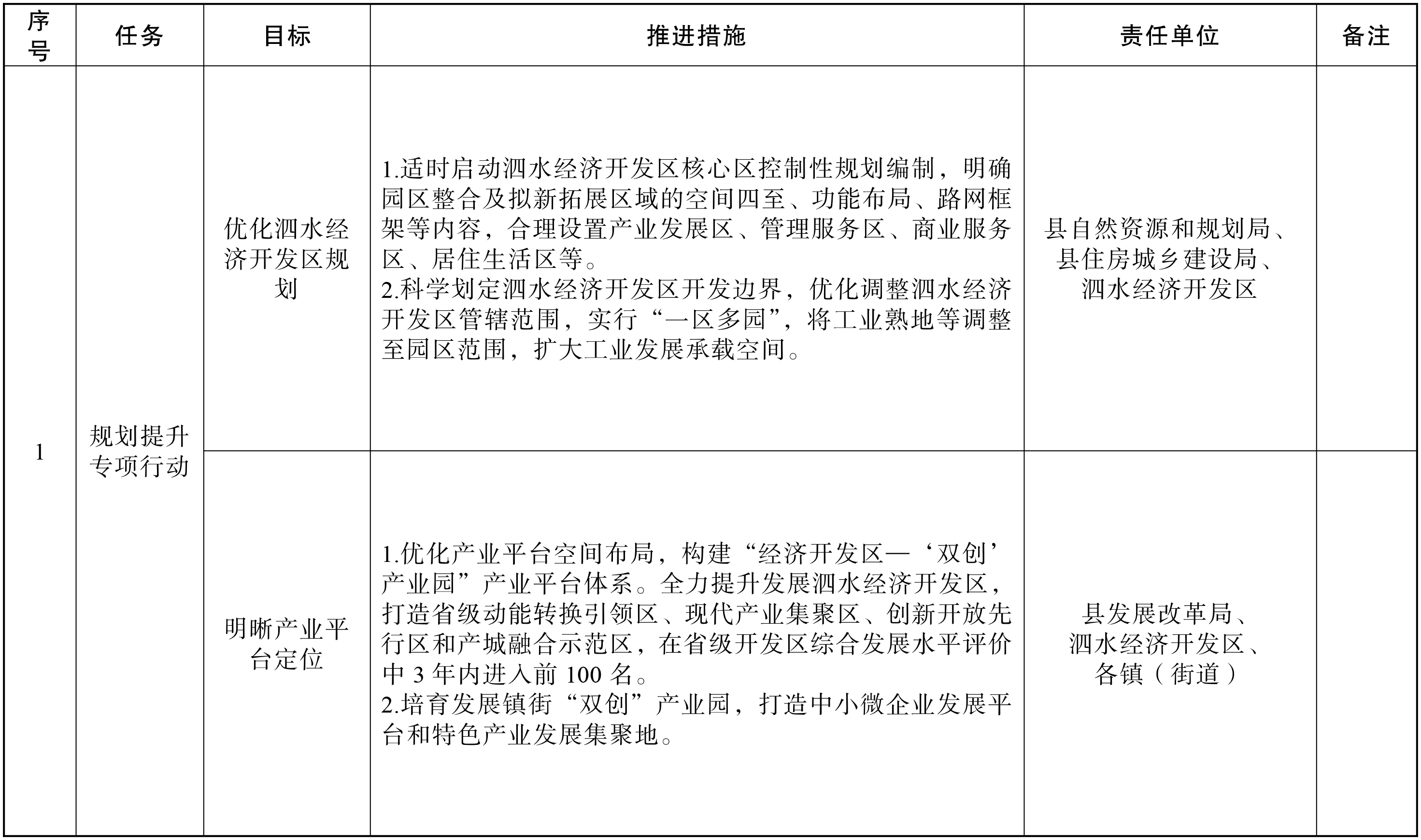 2.明晰产业平台定位。优化产业平台空间布局,构建“泗水经济开发区——‘双创’产业园”产业平台体系。全力提升发展泗水经济开发区,打造省级动能转换引领区、现代产业集聚区、创新开放先行区和产城融合示范区,在省级开发区综合发展水平评价中3年内进入前100名。培育发展镇街“双创”产业园,打造中小微企业发展平台和特色产业发展集聚地。(责任部门:县发展改革局、泗水经济开发区、各镇街)