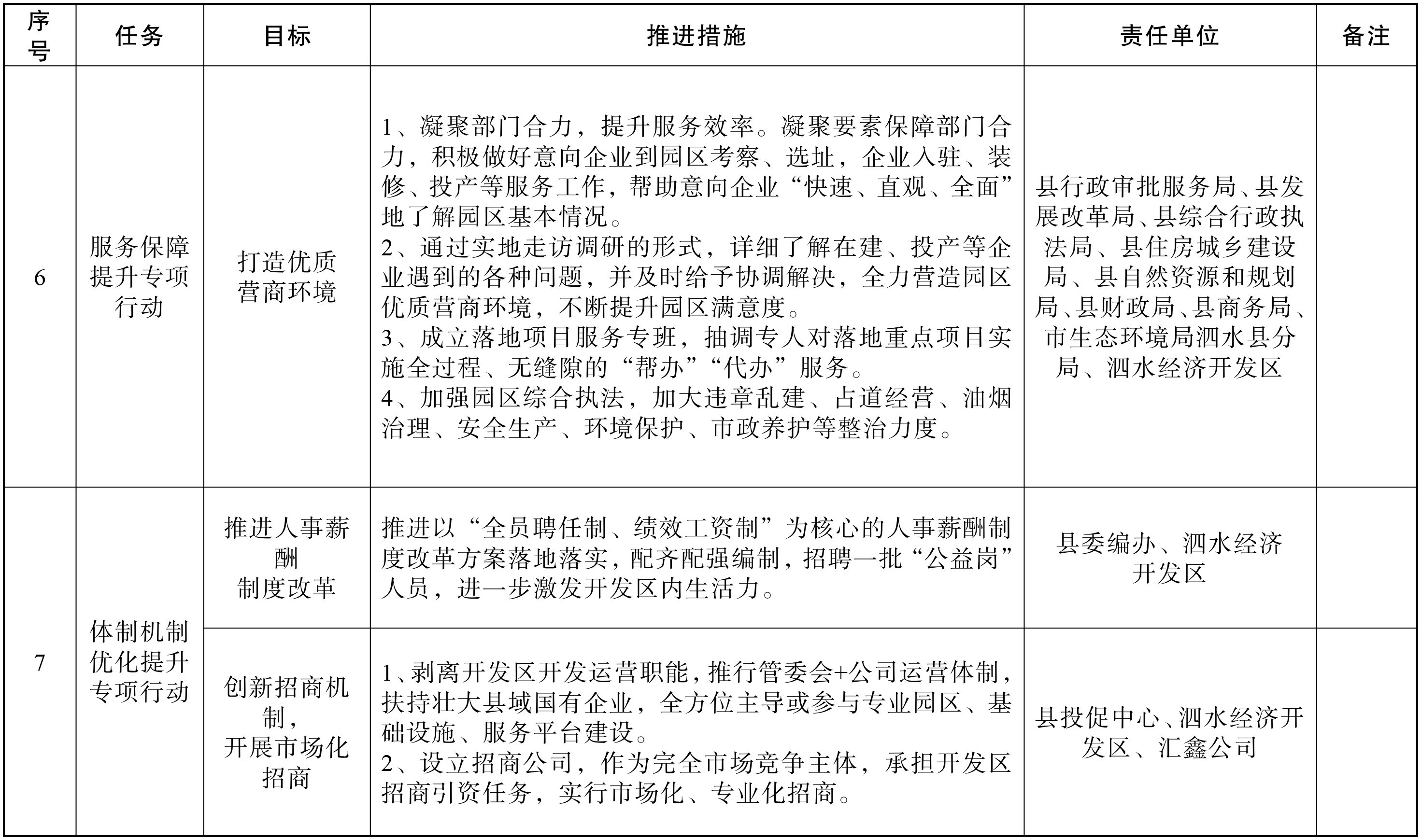 1.推进以“全员聘任制、绩效工资制”为核心的人事薪酬制度改革方案落地落实,配齐配强编制,招聘一批“公益岗”人员,进一步激发开发区内生活力。(责任部门:县委编办、泗水经济开发区)