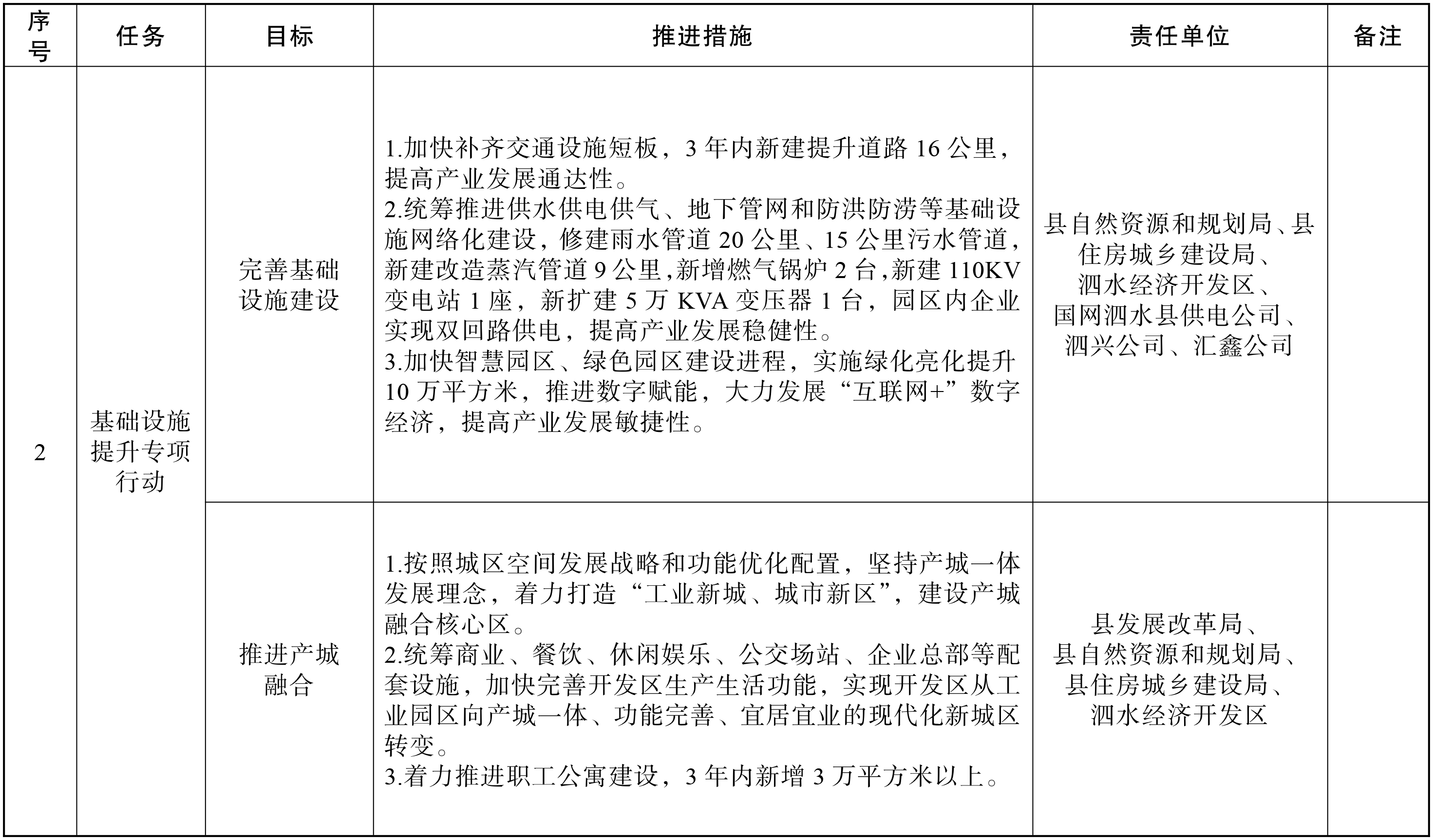 1.完善基础设施建设。加快补齐交通设施短板,3年内新建提升道路16公里,提高产业发展通达性。统筹推进供水供电供气、地下管网和防洪防涝等基础设施网络化建设,修建雨水管道20公里、污水管道15公里,新建改造蒸汽管道9公里,新增燃气锅炉2台,新建110KV变电站1座,新扩建5万KVA变压器1台,园区内企业实现双回路供电,提高产业发展稳健性。加快智慧园区、绿色园区建设进程,实施绿化亮化提升10万平方米,推进数字赋能,大力发展“互联网+”数字经济,提高产业发展敏捷性。(责任部门:县自然资源和规划局、县住房城乡建设局、泗水经济开发区、国网泗水县供电公司、泗兴公司、汇鑫公司)