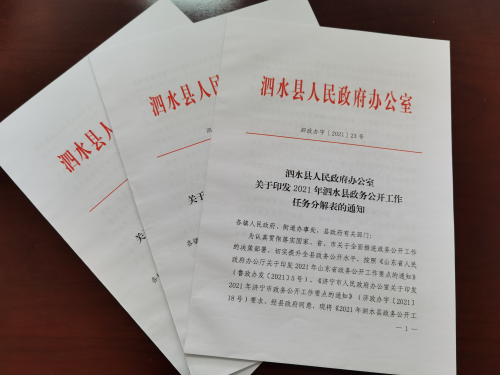 一是加强政府信息管理制度建设,出台政务公开相关文件。以县政府办公室名义印发了《泗水县人民政府办公室关于印发2021年泗水县政务公开工作任务分解表的通知》(泗政办字〔2021〕23号),明确工作任务、具体要求,确定牵头部门、责任单位,确保政务公开工作顺利有序开展。