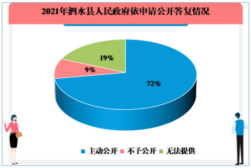 2021年,济宁市泗水县共受理群众政府信息公开申请54件,同比增长8%,其中,县政府受理依申请公开15件,各镇街、单位受理依申请公开39件,全部为自然人申请。均依照法律规定在法定期限内及时予以答复,答复率100%。申请内容涉及环境保护、政府绩效体系、土地征收、房屋征收、棚户区改造等信息。从受理渠道来看,通过信函渠道申请24件,网上渠道申请30件。