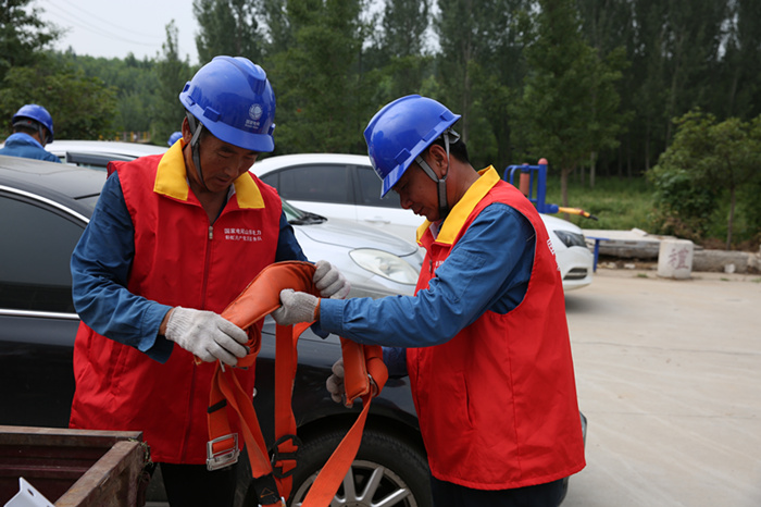 8月19日上午,在泗水县泉林镇柳河峪村文化广场,泗水县供电公司组织“点亮山川”志愿服务队正在为一箱箱高标准太阳能路灯进行拆箱装配中。