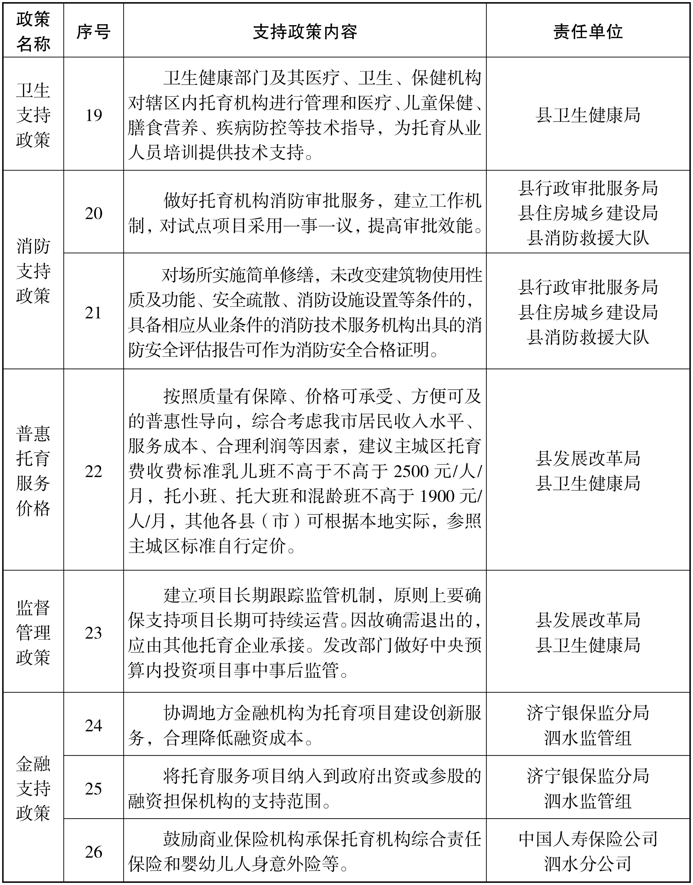 17.降低运营成本。通过提供场地、减免租金等政策措施,支持社会力量、用人单位举办婴幼儿照护服务机构。婴幼儿照护服务机构用电、用水、用气、用暖按居民生活价格执行。认真落实3岁以下婴幼儿照护个人所得税专项附加扣除等国家税收优惠政策。协调地方金融机构为托育项目建设创新服务,合理降低融资成本。鼓励保险资金投资婴幼儿照护服务领域,承保婴幼儿照护服务责任保险和婴幼儿人身意外险。优化机构登记、备案等程序,切实优化托育服务营商环境。(责任单位:县发展改革局、县财政局、县行政审批服务局、济宁银保监分局泗水监管组、县税务局)
