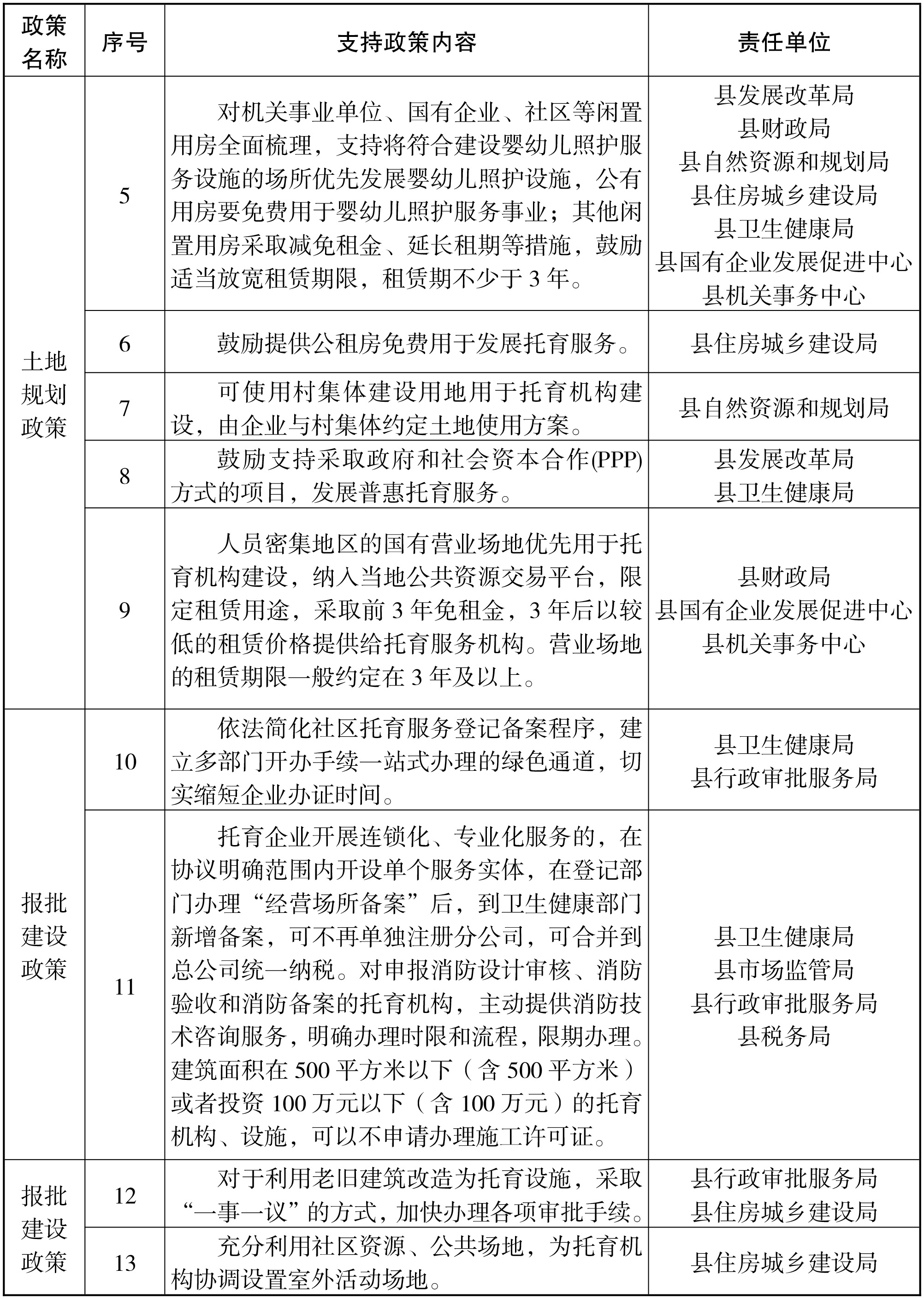 5.强化场地设施保障。综合利用社区卫生服务中心、幼儿园等公共服务资源,改建普惠性婴幼儿照护服务设施。对机关事业单位、国有企业、社区等闲置用房全面梳理,支持将符合建设婴幼儿照护服务设施的场所优先发展婴幼儿照护设施,公有用房要免费用于普惠性婴幼儿照护服务事业;其他闲置用房采取减免租金、延长租期等措施,鼓励适当放宽租赁期限,租赁期不少于3年。(责任单位:县发展改革局、县自然资源和规划局、县住房城乡建设局、县卫生健康局、县行政审批服务局、县机关事务服务中心、县泗兴集团)