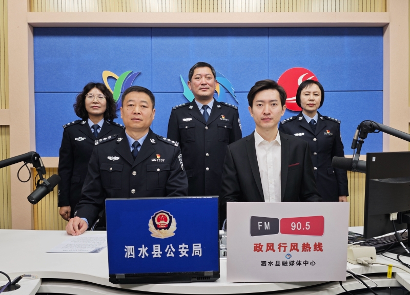 主持人:【欢迎回来。收音机前的听众朋友以及电视机前的观众朋友,您现在关注的是泗水县融媒体中心、泗水广播电视台正在直播的《政风行风热线》,我是主持人李海蛟,今天上线的嘉宾单位是县公安局,带队走进直播间的是县公安局党委委员、副局长赵凯。同时来到直播间的嘉宾还有: