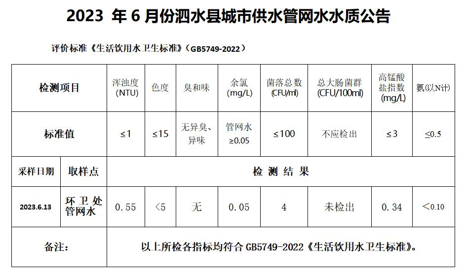 【供水厂出水安全状况】2023年6月份水质检测报告