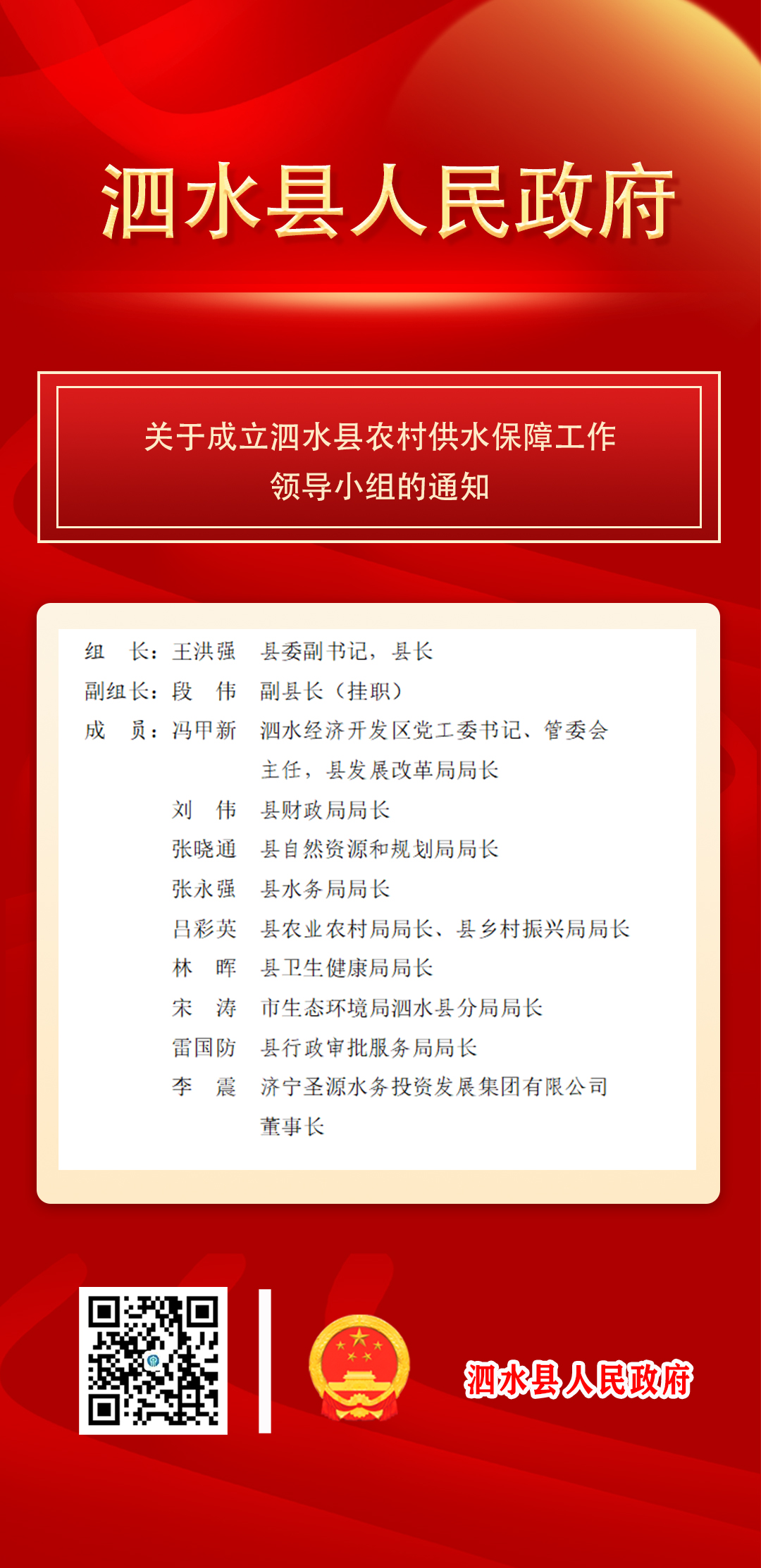 【图文解读】泗政办字〔2023〕22号泗水县人民政府办公室关于成立泗水县农村供水保障工作领导小组的通知