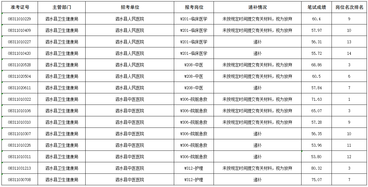 根据《2024年泗水县卫生健康局所属事业单位公开招聘工作人员简章》规定,经审查不具备报考条件的,取消其面试资格。在规定时间内未提交相关材料的,视为弃权。因取消资格或弃权造成的空缺,按笔试成绩依次递补。现将递补人员名单公示如下: