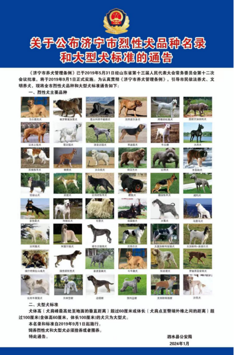 关于公布济宁市烈性犬品种名录和大型犬标准的通告