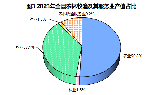 农业生产稳定发展。全县农林牧渔业总产值实现108.8亿元,增长5.3%。其中农业55.23亿元、增长7.3%,林业1.68亿元、增长31.9%,牧业40.34亿元、增长3.3%,渔业1.58亿元、增长8.4%,农林牧渔服务业9.98亿元、增长8.8%。农、林、牧、渔及其服务业产值比例为50.8:1.5:37.1:1.5:9.2。