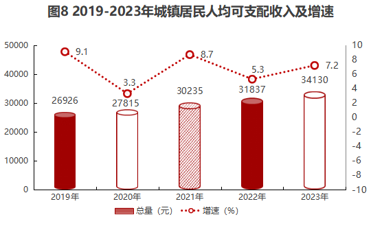 居民生活持续改善。全县居民人均可支配收入25731元、增长7.9%,其中城镇居民人均可支配收入34130元、增长7.2%,农村居民人均可支配收入19079元、增长8.9%,城乡居民收入倍差由上年的1.82下降为1.79,缩小了0.03。城镇、农村居民人均消费性支出分别为18537元、12400元,分别增长6.9%、10.9%。城乡居民居住条件继续改善,城镇居民人均建筑住房面积43.2平方米,农村居民人均住房面积44.8平方米。