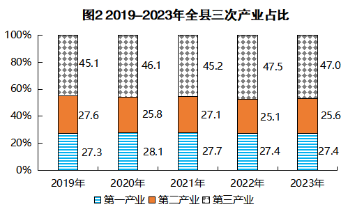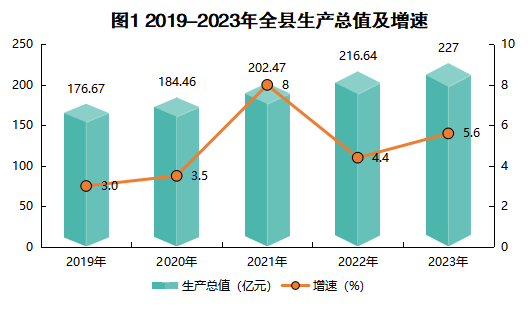 经济运行稳中有升。初步核算,2023年全县生产总值(GDP)实现227亿元,按不变价计算,同比增长5.6%。其中,第一产业增加值62亿元,增长4.7%;第二产业增加值58亿元,增长4.9%;第三产业增加值107亿元,增长6.6%。分行业看,农林牧渔业增加值为63.3亿元、增长4.8%,工业增加值为45.3亿元、增长3%,建筑业增加值为12.9亿元、增长14.4%,批发和零售业增加值为17.6亿元、增长9.3%,交通运输、仓储和邮政业增加值为6.4亿元、增长3.4%,住宿餐饮业增加值为5.7亿元、增长9%,金融业增加值为12.1亿元、增长8.9%,房地产业增加值为12.4亿元、下降0.2%,其他服务业增加值为51.06亿元、增长6.7%。三次产业结构比为27.4:25.6:47.0,对经济增长的贡献率分别为23.5%、21.5%、55%,分别拉动经济增长1.3、1.2、3.1个百分点。