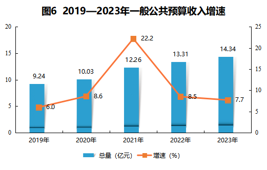 财政收支运行平稳。一般公共预算收入14.34亿元,同比增长7.7%。其中税收收入9.51亿元,同比增长1.2%,税收占比66.3%;一般公共预算支出44.3亿元,同比增长3.2%。