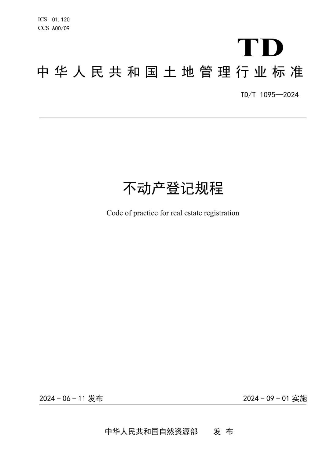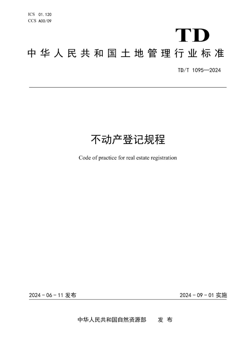 为规范不动产登记工作,提高登记效能,保证登记质量,推动不动产登记工作向高质量发展迈进,自然资源部于2024年6月11日发布了包含《不动产登记规程》(中华人民共和国土地管理行业标准TD/T 1095—2024)在内的19项行业标准。该《规程》已通过全国自然资源与国土空间规划标准化技术委员会审查,并经2024年第3次部长办公会审议通过,现予批准、发布,并将于2024年9月1日起正式实施。