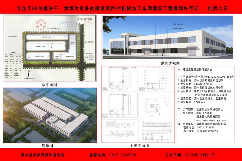 年加工80台套饼干、烤馍片设备的建设项目4#机械加工车间建设工程规划许可证批后公示