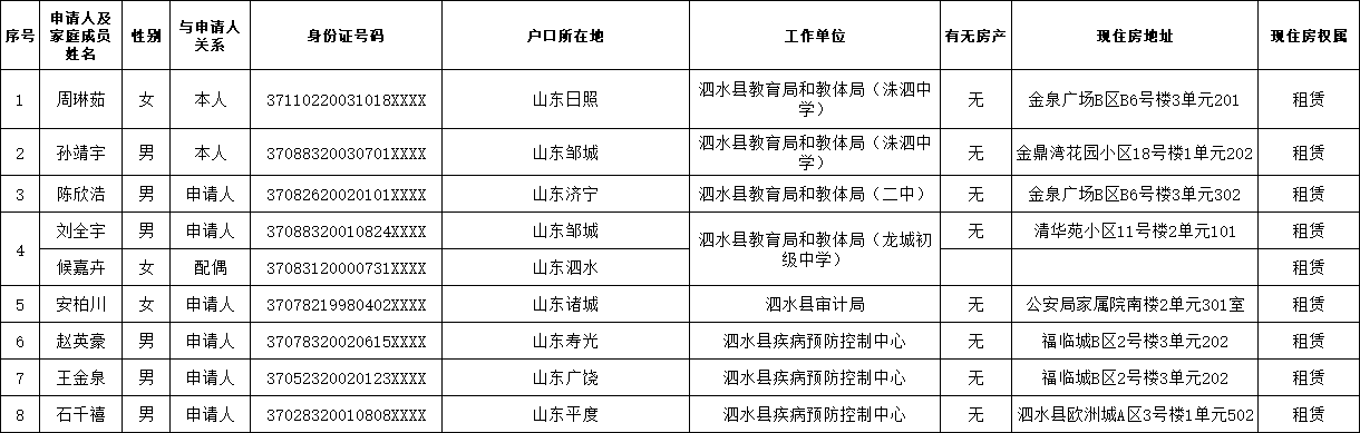 根据《关于泗水县新就业无房职工阶段性住房租赁补贴申请的通告》有关规定,我单位受理了以下8户家庭的申请,为接受社会监督,现予以公示,公示期 5 天。经公示无异议和异议不成立的,将上报住房保障申请主管单位。 联系电话:6598123