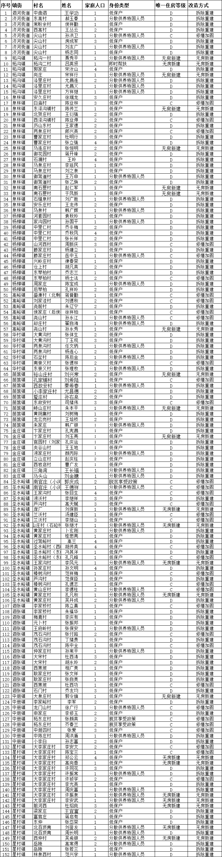 经农户住房安全等级鉴定,县农业农村局、县民政局对改造对象身份类别认定,镇、村两级审核公示,现将以下拟实施危房改造的152户农户情况进行公示,公示期3天。