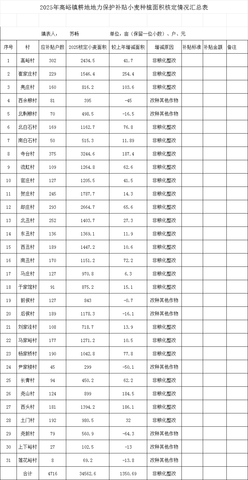 高峪镇2025年小麦补贴项目核定种植面积公示