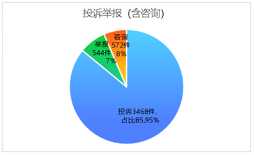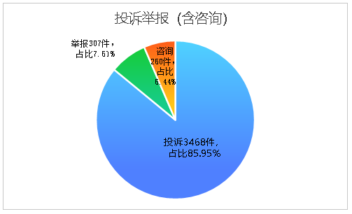 2025年上半年,我局共受理投诉举报(含咨询)4035件。其中:12345政务便民服务热线(平台)2967件,占比73.53%;12315投诉举报平台689件,占比17.08%;来人来电来函379件,占比9.39%。投诉3468件,占比85.95%;举报307件,占比7.61%;咨询260件,占比6.44%。