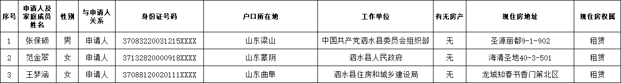 根据《关于泗水县新就业无房职工阶段性住房租赁补贴申请的通告》有关规定,我单位受理了以下3户家庭的申请,为接受社会监督,现予以公示,公示期 5 天。经公示无异议和异议不成立的,将上报住房保障申请主管单位。 联系电话:6598123