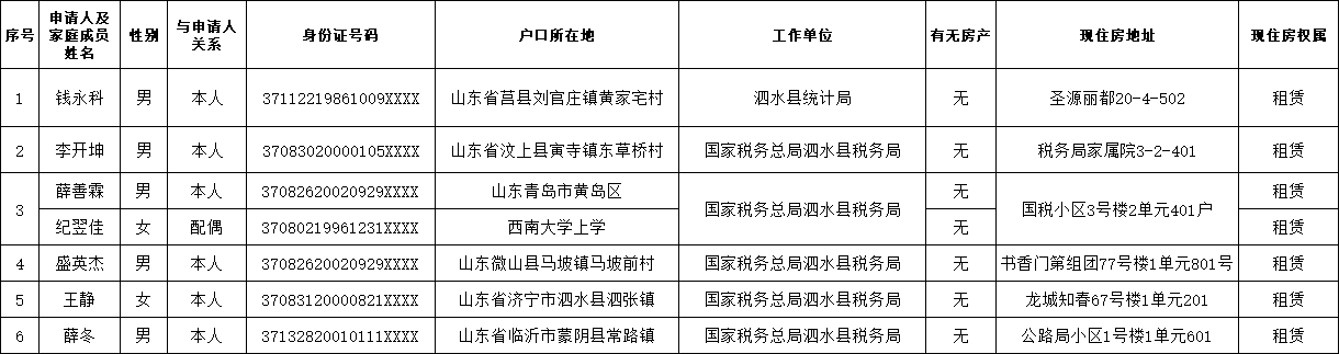 根据《关于泗水县新就业无房职工阶段性住房租赁补贴申请的通告》有关规定,我单位受理了以下6户家庭的申请,为接受社会监督,现予以公示,公示期 5 天。经公示无异议和异议不成立的,将上报住房保障申请主管单位。联系电话:6598123
