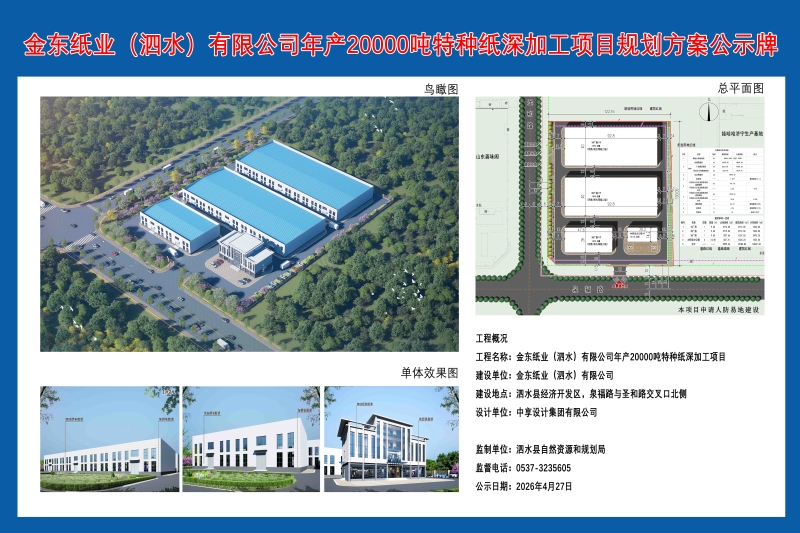 金东纸业(泗水)有限公司年产20000吨特种纸深加工项目规划方案批前公告