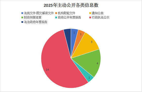 2025年,我局进一步聚焦群众关切,加大主动公开力度,全面、及时、精准发布相关政务信息,以公开促落实、促规范、促服务。泗水县工业和信息化局2025年主动公开各类信息数25条:法规文件-图文解读文件1条,机构职能文件1条,通知公告3条,财政预算决算4条,政府公开年度报告1条,行政执法公示14条,法治政府年度报告1条。
