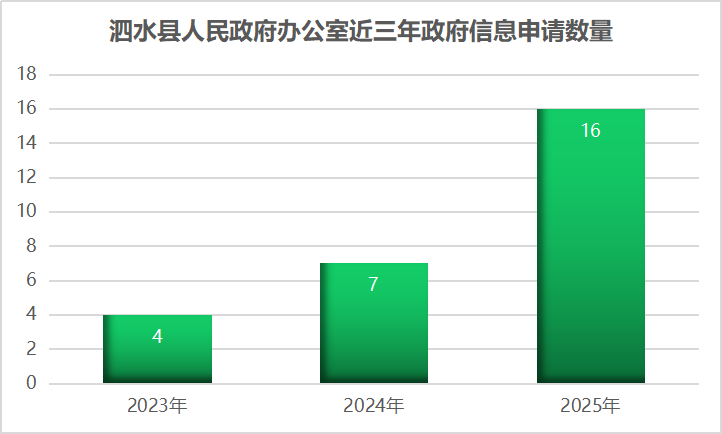 2025年,泗水县人民政府办公室共收到群众政府信息公开申请16件,全部为自然人申请,比去年增加9件,未收取任何费用。申请内容涉及土地征收、政府文件、经济发展、公共卫生等,均依照法规规定在法定期限内予以答复,答复率100%。无因政府信息公开工作被申请行政复议、提起行政诉讼情况。